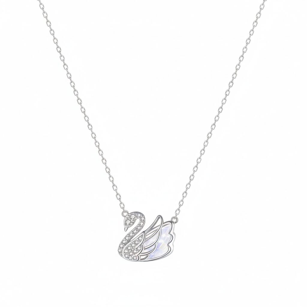 Нежно сребърно колие с изящен лебед, обсипан с фини циркони и перлени детайли, които отразяват светлината с елегантна мекота. „Финес“ е символ на стил и изтънченост – създадено за жената, която излъчва спокойна увереност и красота.