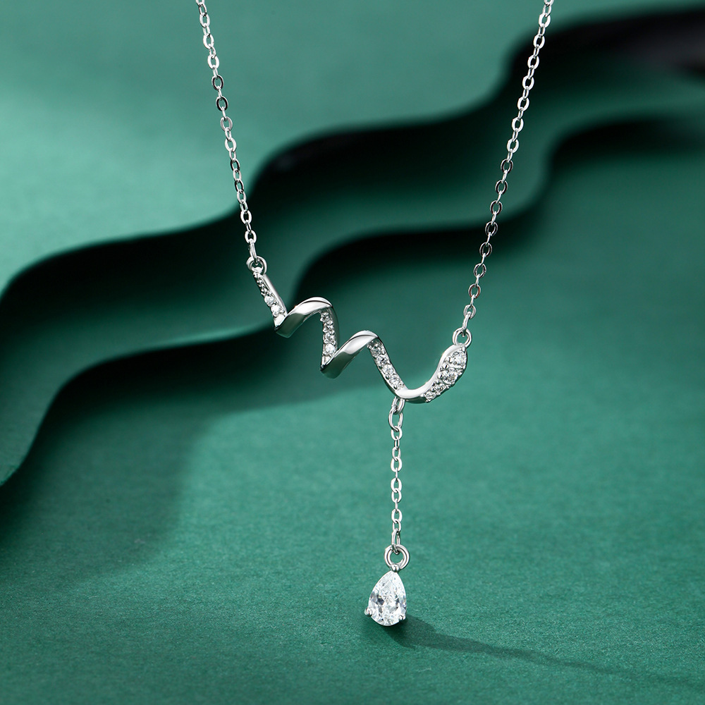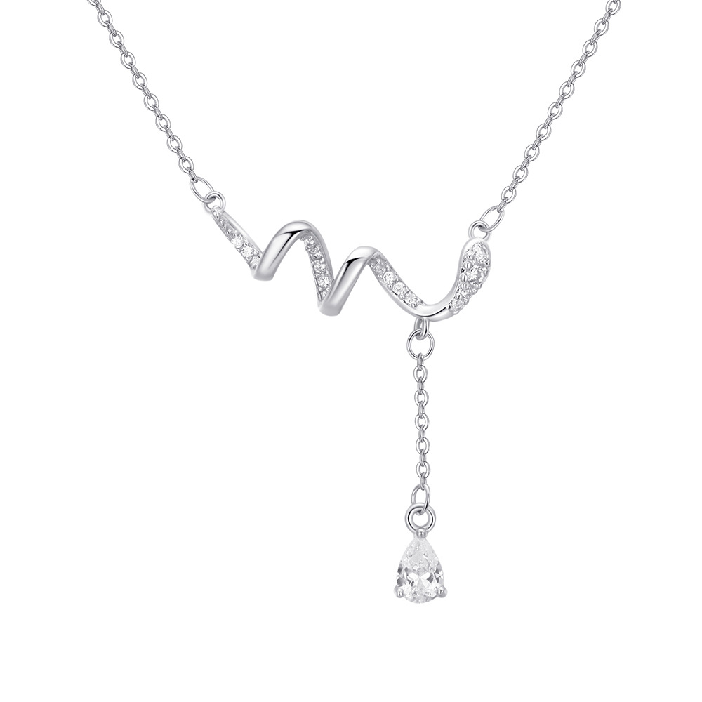 Изящно колие със сребърна извивка, инкрустирана с циркони, и висящ капковиден кристал. „Импулс“ символизира енергията на живота и красивия ритъм на чувствата – модерно бижу с елегантен блясък и характер.