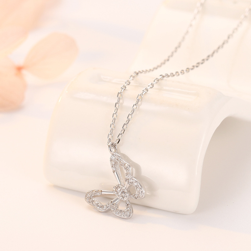 Сребърно колие във формата на пеперуда в класически сребърен цвят. Изработката е много фина, поради което колието изглежда елегантно и изящно. Крилете на пеперудата са посипани с бляскави кристали кубичен цирконий.