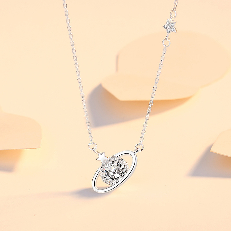 Впечатляващо сребърно колие, вдъхновено от красотата на Вселената. Централният камък сияе като планета, обгърната от фина орбита и звезда – символ на мечти, движение и безкрайност.