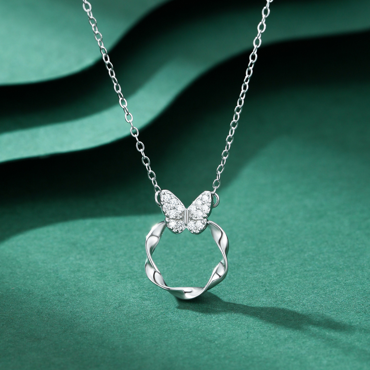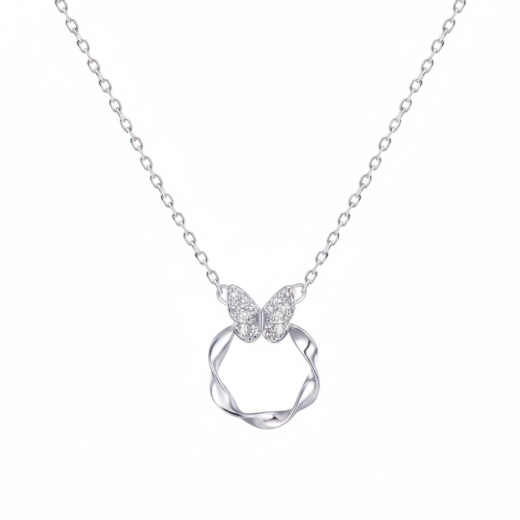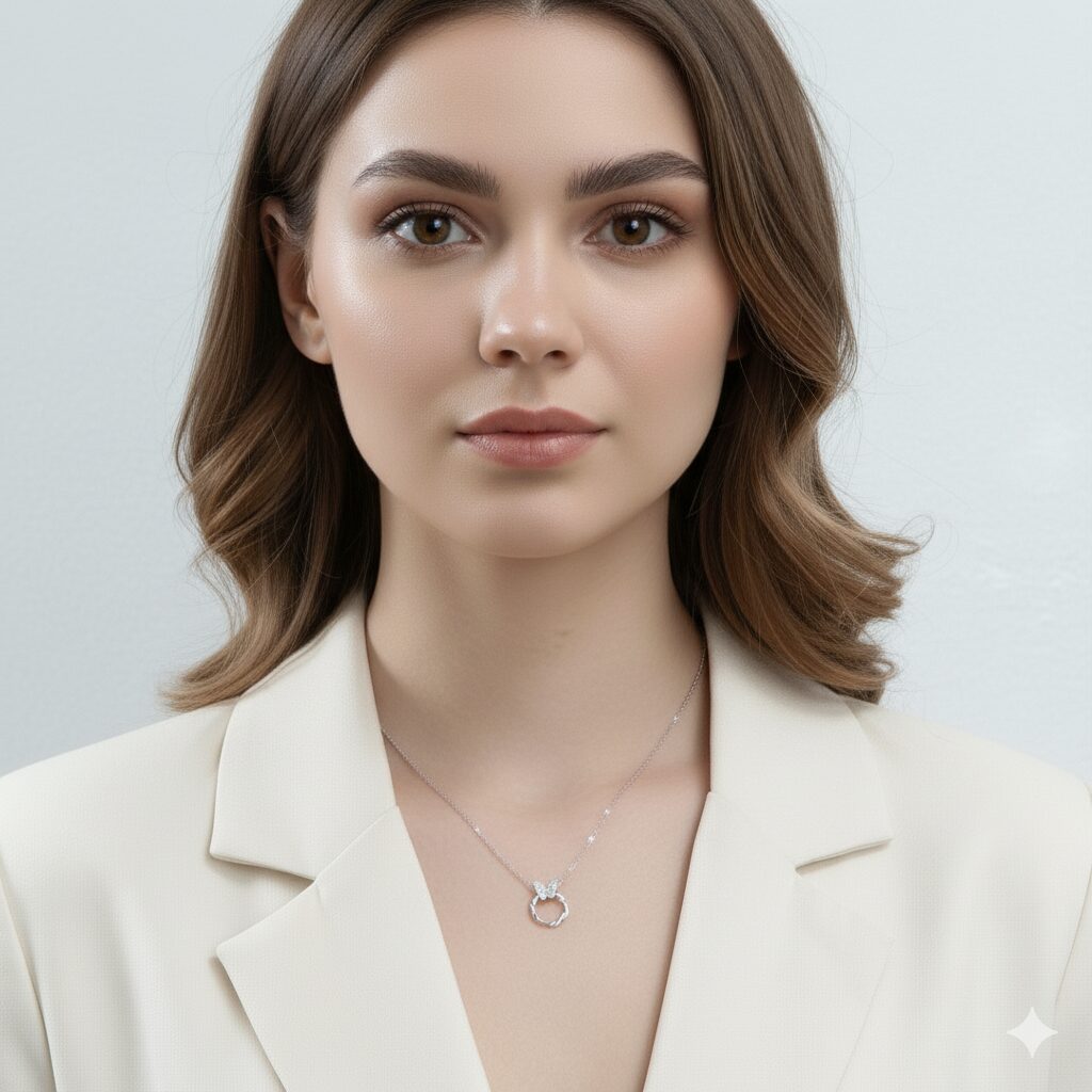 Фино колие със сребърна пеперуда, кацнала върху усукан пръстен – символ на вътрешна хармония и деликатен баланс. „Равновесие“ е изящно бижу, което носи усещане за завършеност и стилна лекота