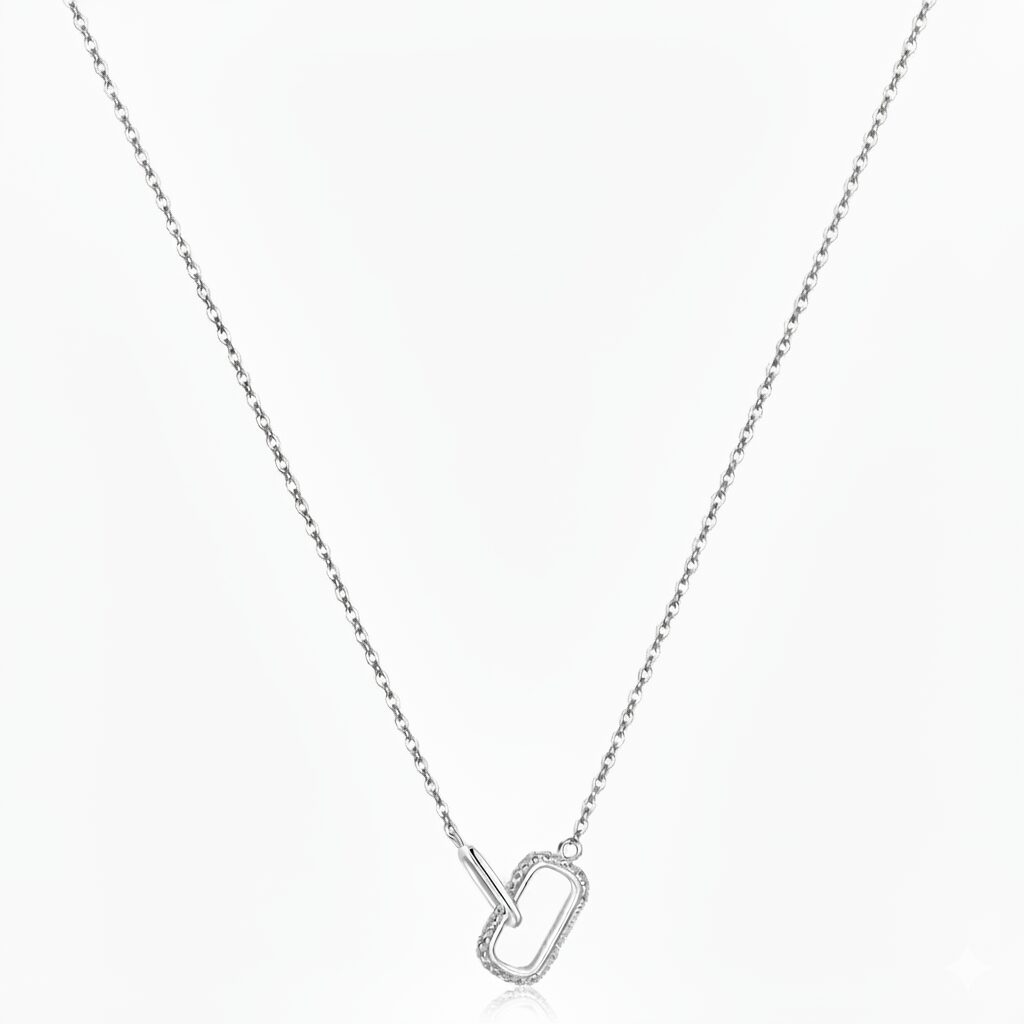 Модерно сребърно колие с предна закопчалка и елегантен овален елемент, обсипан с фини циркони. „Съзвучие“ е символ на хармонията между сила и нежност – бижу, което подчертава изискаността и вътрешния баланс на своята притежателка.