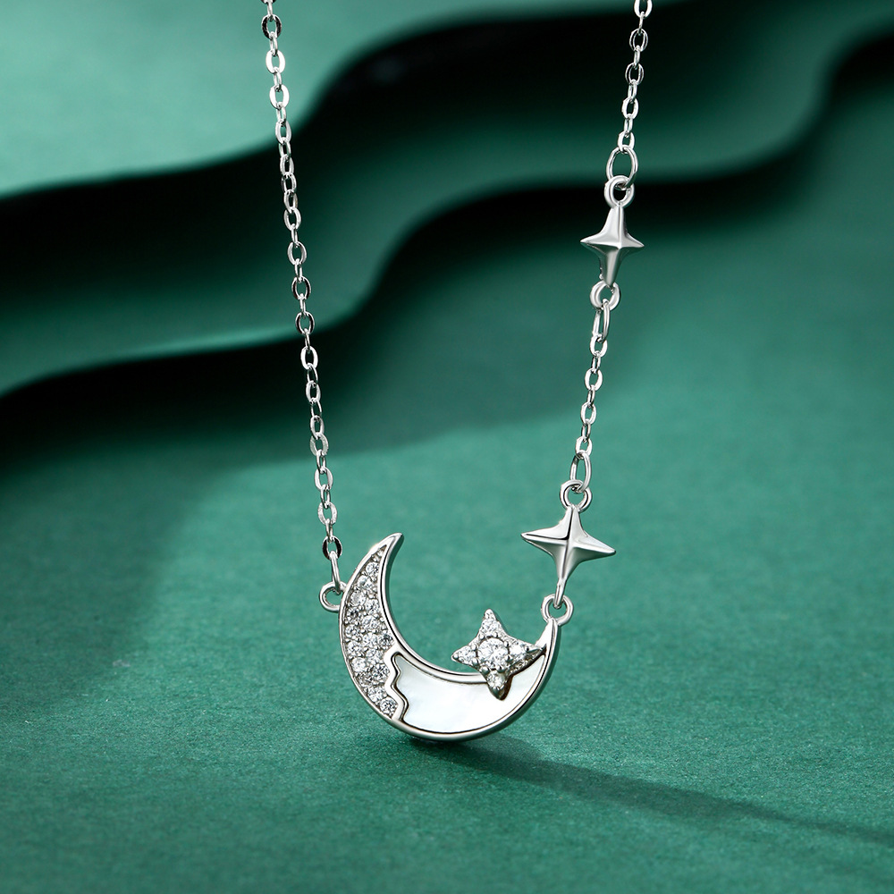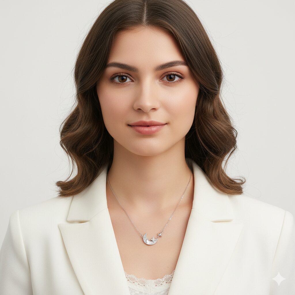 Очарователно сребърно колие с полумесец и звезда, обсипани с циркони, и ефирни акценти по верижката. „Звезден сън“ е бижу, вдъхновено от нощното небе – символ на нежност, мечти и магични моменти.